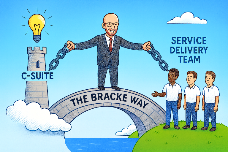 How? By doing things my way: The Bracke Way: providing the “missing link” that is bridging the gap between the ideas and inspiration from the C-suite on one side, and the Service Delivery Team that is close to your customers on the other side. Finding solutions and ways to have the Service Team accept and implement the change sustainably: from the bottom-up.