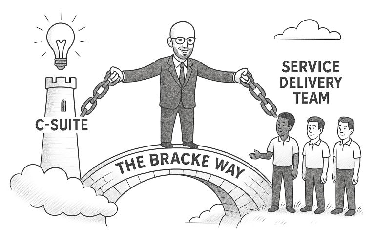 How? By doing things my way: The Bracke Way, providing the “missing link” and bridging the gap between the ideas and inspiration from the C-suite on one side, and the Service Delivery Team that is close to your customers on the other side. Finding solutions and ways to have the Service Team accept and implement the change sustainably, from the bottom-up.
